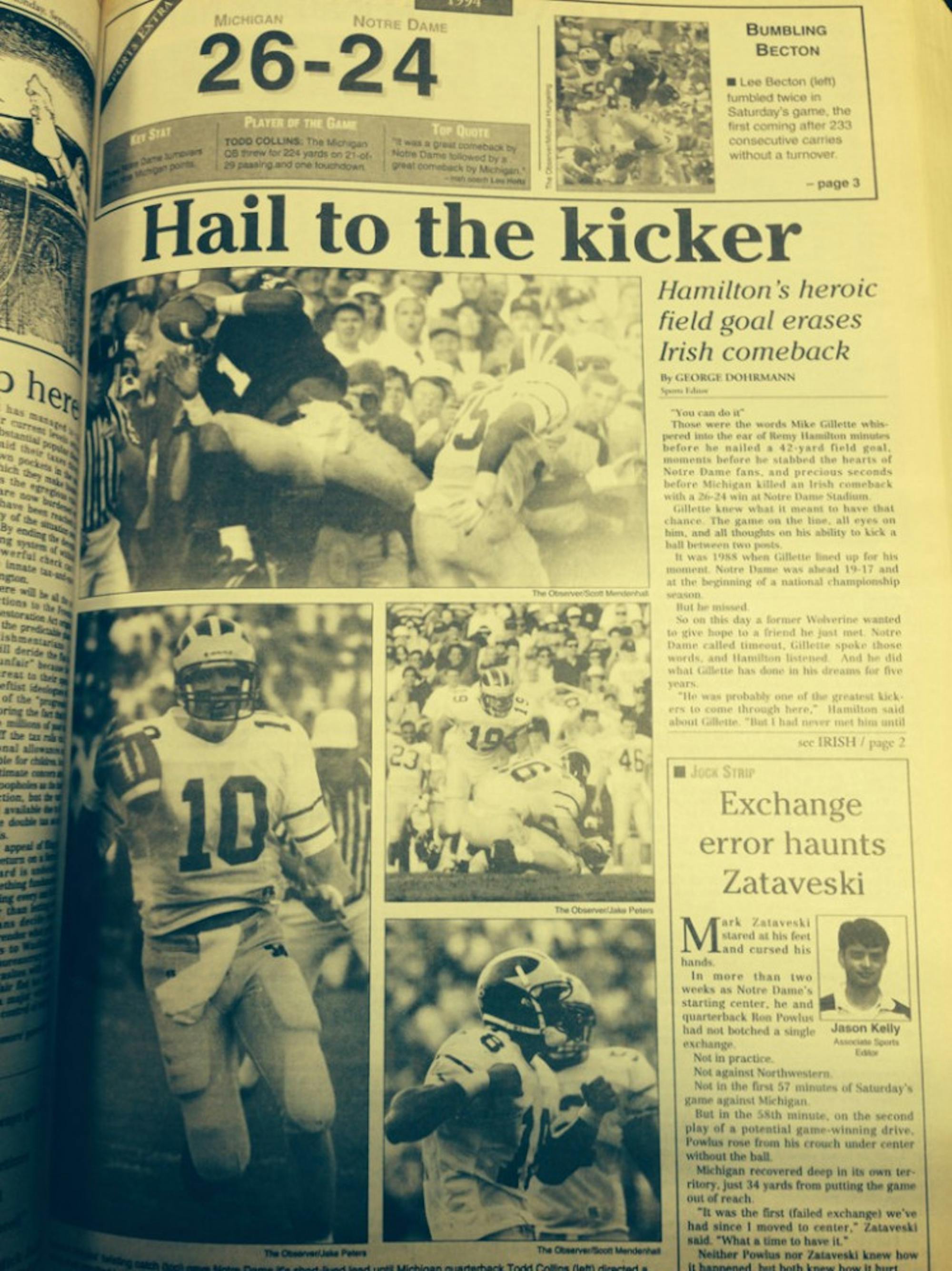 Notre Dame stormed ahead with a few minutes left in the game, but Wolverines quarterback Todd Collins led Michigan down the field, and kicker Remy Hamilton buried a game-winning field goal.