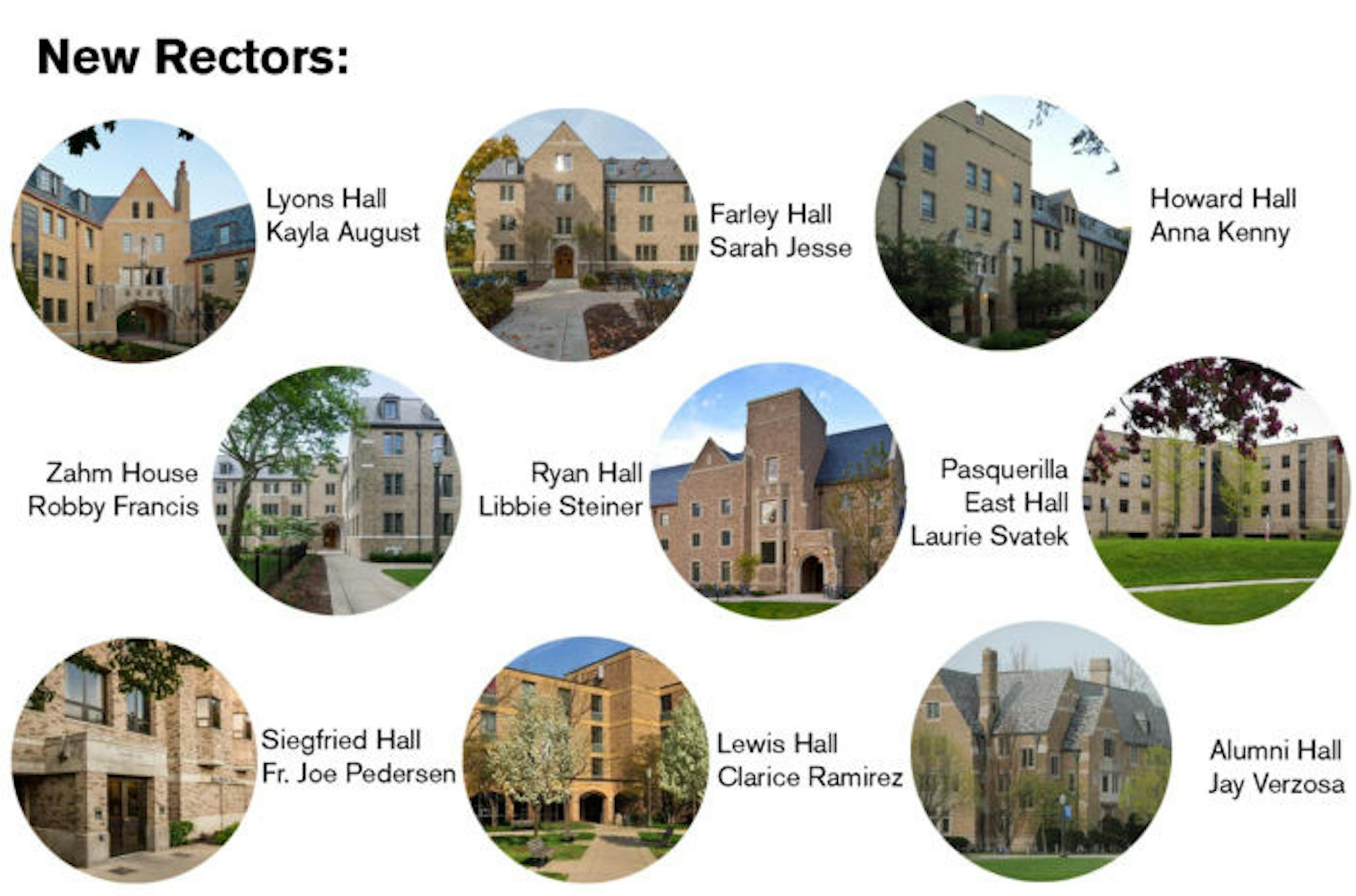 Francis joins the Notre Dame community following his departure from Saint Louis University, where he was a campus minister and minster for students living in the university’s residence halls. “For the past six years I worked as a Campus Minister at Saint Louis University,” Francis said in an email. “There I led retreats, provided spiritual direction, ministered to students in the residence halls, coordinated faith-based small groups and worked with students involved in fraternity and sorority life. Prior to working at SLU, I worked in youth ministry for the Archdiocese of St. Louis.”Francis said the role of being a rector appealed to him because it combined many things he enjoyed.“The role of the rector really is a combination of so many of the things I enjoy doing,” he said in the email. “It’s ministry, it’s community building, it’s being present to guys as they walk through life.”Among Francis’ goals for Zahm House is to build on the relationships in the dorm, he said.“I’m a big believer in the importance of relationships, and my goal is to be as intentional as I can in forming those relationships,” he said in the email. Jesse is from Ohio, but is already familiar with Notre Dame’s campus — she graduated from ND with majors in theology and psychology. After receiving her diploma, she went to work at a university in Ireland as a ecumenical chaplain before becoming Farley Hall’s new rector.Kenny rooted her career in residential life, from her undergraduate degree at Aquinas College to her graduate degree at Central Michigan University. She served in some capacity as a residential assistant at both schools.In an email, Kenny said she was drawn to Notre Dame by “the welcoming and genuine care of and for [the] community by faculty, staff and students.”After growing up in Waterloo, Iowa, Pedersen graduated from Notre Dame and then went on to work at an Indianapolis parish for two years doing young adult and college campus ministry. Following his time in Indianapolis, Pedersen taught high school religion for two years in Minneapolis and recently has been in formation with the Congregation of Holy Cross.“Since I first began as a student at Notre Dame in 2005, I have admired rectors and the work they do,” Pedersen said in an email. “When my superiors in Holy Cross invited me to this position, I was excited to have the opportunity to follow in their footsteps.” Pedersen said he is also excited to help Siegfried defend their O’Leary Cup for residential athletic achievement. A native of Los Angeles, Ramirez has past experience working at Notre Dame. She has worked in Notre Dame’s Office of Undergraduate Admissions, Office of Residential Life and Office of Student Success, which assists students who are at high-risk of dropping out of college. Ramirez said in an email she was drawn to rectorship in a unique way — through word of mouth.“A really great friend of mine that I met in grad school is an alum and lived in Lyons,” Ramirez said. “During our classes, she would often talk about her experience at Notre Dame, especially about her rector and the profound effect she had on her formation throughout undergrad.” Ramirez said she is excited to embrace Lewis in all its traditions and community. “I’m extremely excited to build great relationships with all of my Lewis chicks, especially my freshmen,” Ramirez said. “Also, I’m excited to wear a chicken suit!” Steiner is an Oregon native and graduated from Boston College before completing her master’s degree in theology at Notre Dame. Following graduation, Steiner worked at Saint Gabriel Parish in Indianapolis. Steiner said in an email she wants to “continue to emphasize and expand Ryan Hall’s charism of accessibility and inclusion.”Svatek, a Wisconsin native, served in the higher education field and university ministry for over 15 years before joining Notre Dame. Svatek previously served as the director of campus ministry at St. Catherine University in St. Paul, according to the University’s residential life webpage. Hailing from Baltimore, Verzosa received multiple diplomas from Boston College in multiple fields — a bachelor’s degree in English and philosophy and master’s degrees in counseling psychology and pastoral ministry. He served for several years in various campus ministries, advising students and helping undergrads find homes on their campus. Svatek declined to interview due to time constraints. Jesse and Verzosa did not respond after initial email correspondence. None of the nine responded to a request for comment about the University’s new ID card policy.