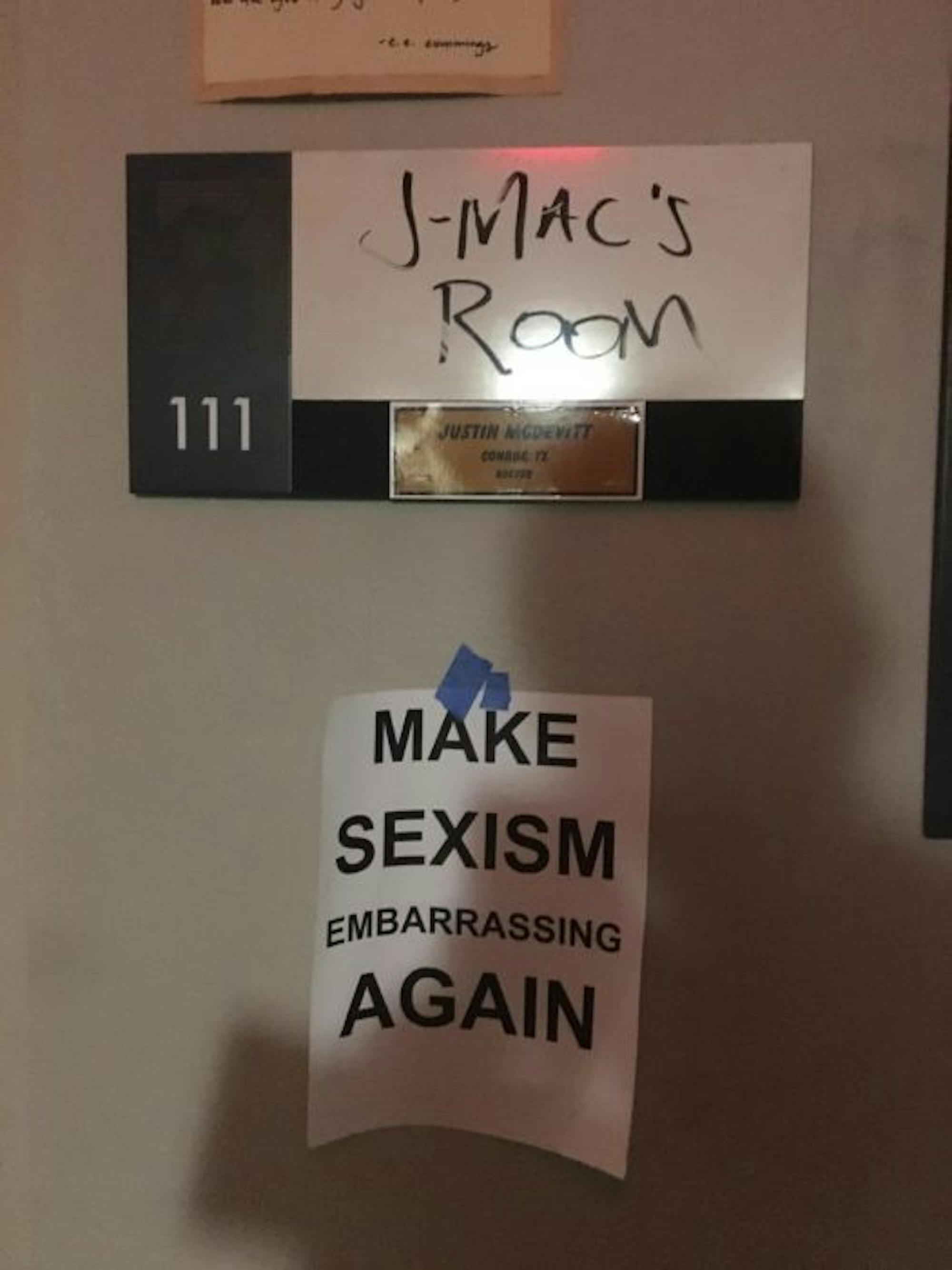 A sign that reads "Make sexism embarrassing again” is taped up next to Stanford rector Justin McDevitt’s apartment for the student protest Sunday morning. Approximately 30 organizers sat protesting an adjacent hallway.