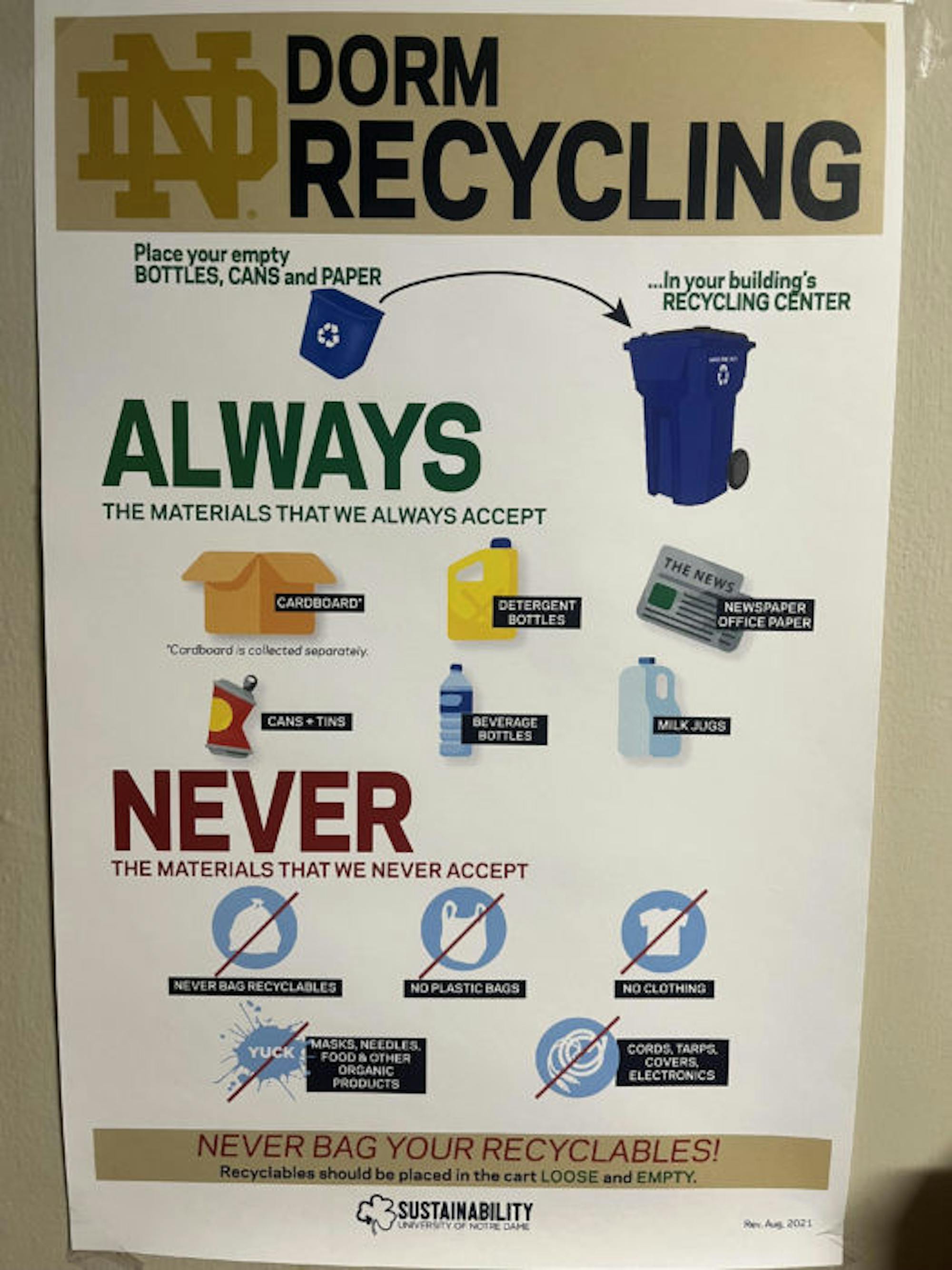 Kirwan said that Notre Dame’s recycling system accepts a lot less material than students are used to recycling at home. Even with the help of posters, students’ prior recycling habits may be difficult or confusing to rewire.