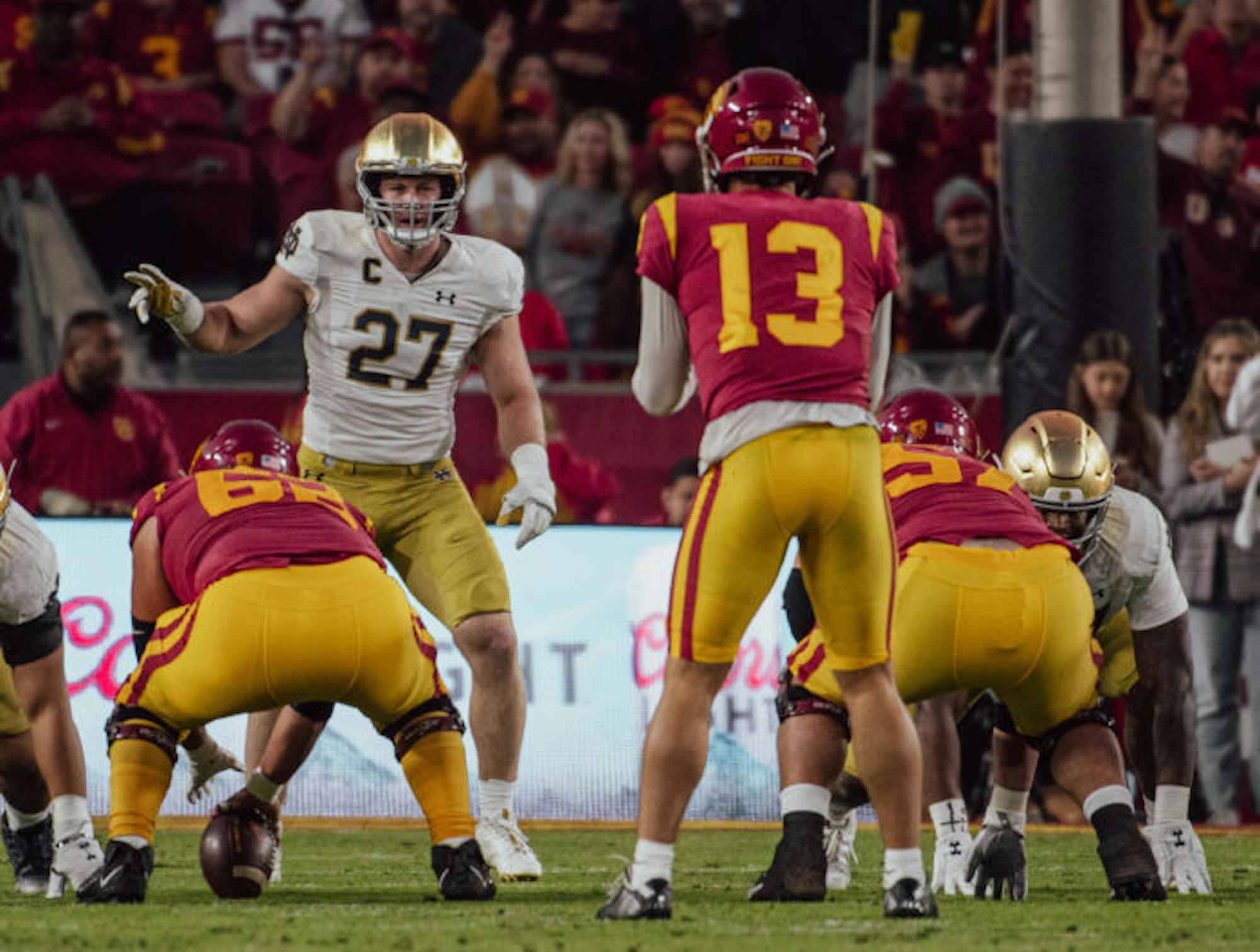 Irish linebacker JD Bertrand lines up across from Trojan quarterback Caleb Williams during Notre Dame's 38-27 loss to USC on Saturday night. Ryan Vigilante | The Observer