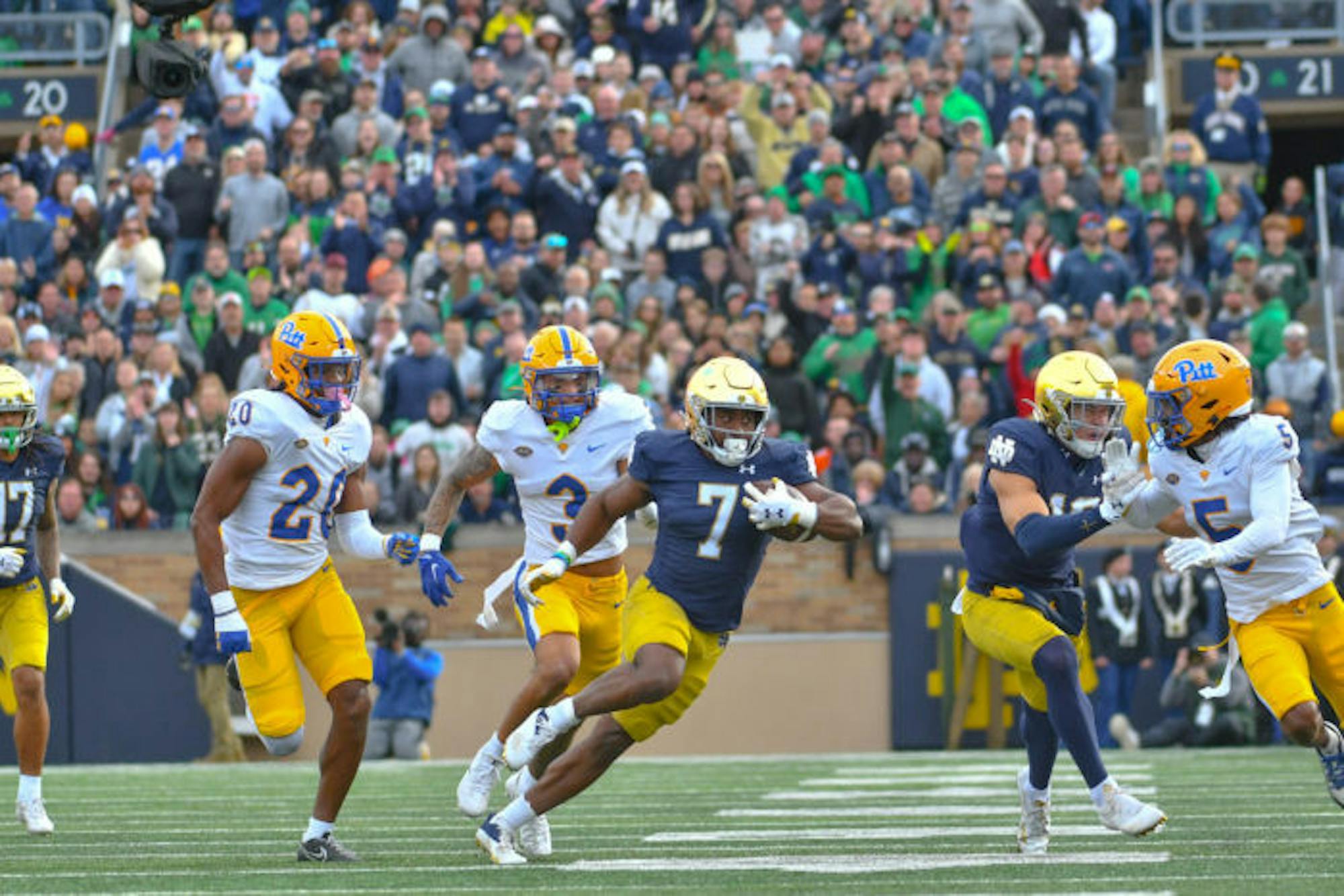 It's been a while since graduate student Sam Hartman was truly on his A-game. At the same time, other than the Louisville game, Hartman has mostly avoided the big mistakes that occasionally plagued him at Wake Forest. That wasn't the case early against Pitt, as Hartman threw interceptions on each of Notre Dame's first two drives. He also threw a pass on the second drive before the pick that easily could've been intercepted as well.To his credit, Hartman threw only five more incompletions the entire game. The deep ball that was missing from the Irish attack the last few weeks also made its long-awaited return. Hartman tossed five passes that went for 20 or more yards. Three went for 40-plus, and all of those passes were thrown to different receivers. He finished a respectable 18-25 for 288 yards, although he didn't throw for a single touchdown.
