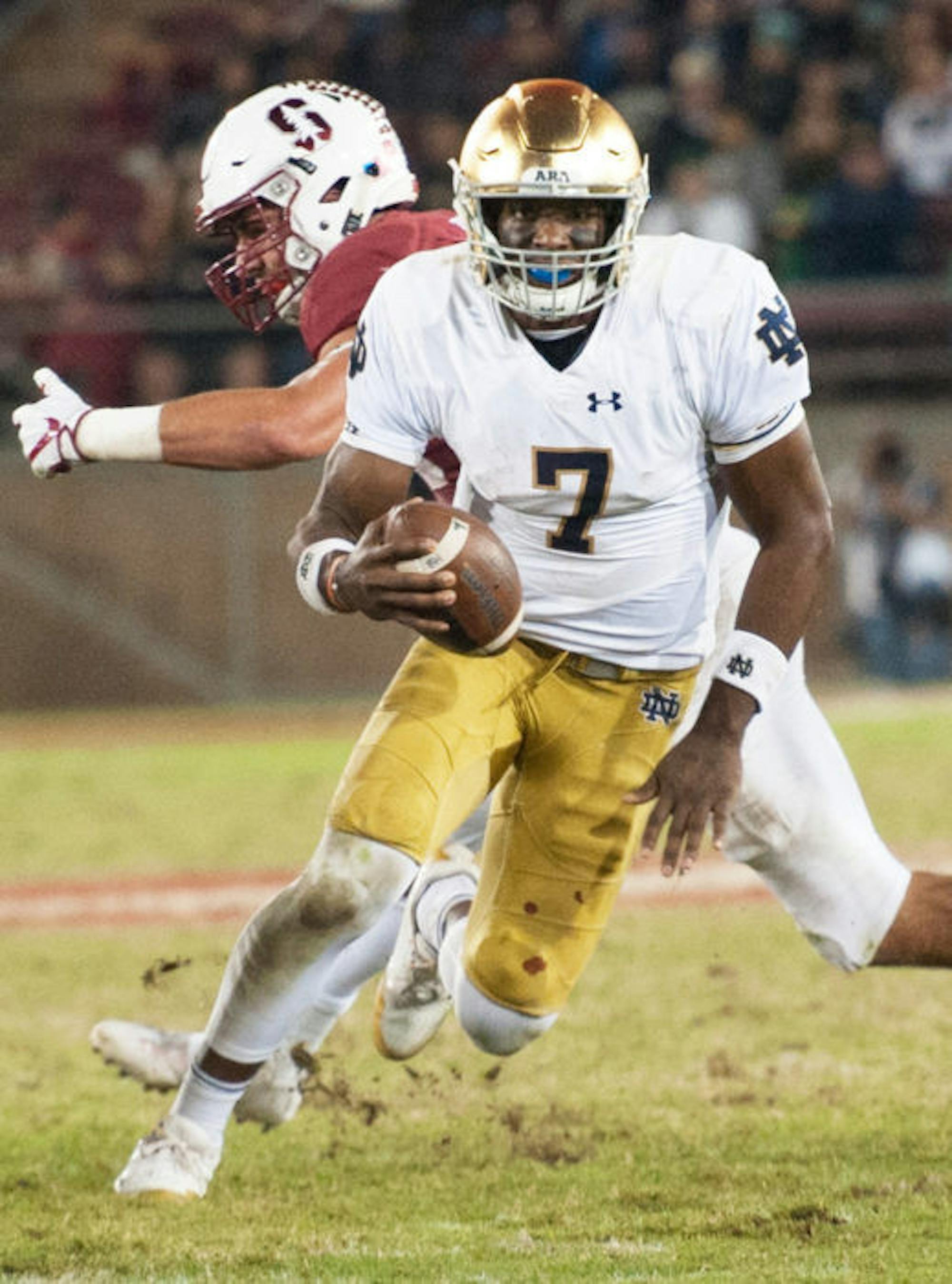 Irish senior quarterback Brandon Wimbush cuts down field to avoid a Stanford defender during Notre Dame's 38-20 loss to the Cardinals on Nov. 25.
