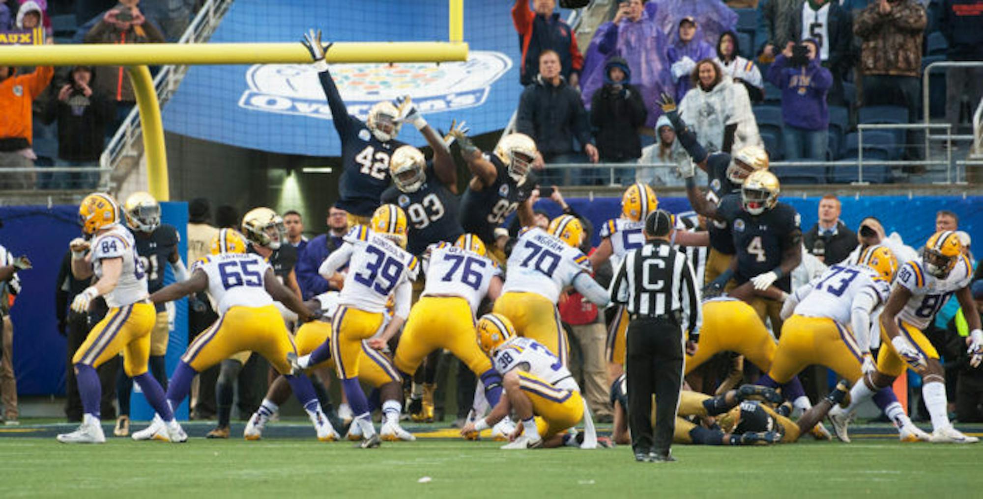 Irish graduate student defensive end Jay Hayes, center, attempts to block a field goal Jan. 1 at the Citrus Bowl at Camping World Stadium against LSU. Hayes will not return to the team next year.
