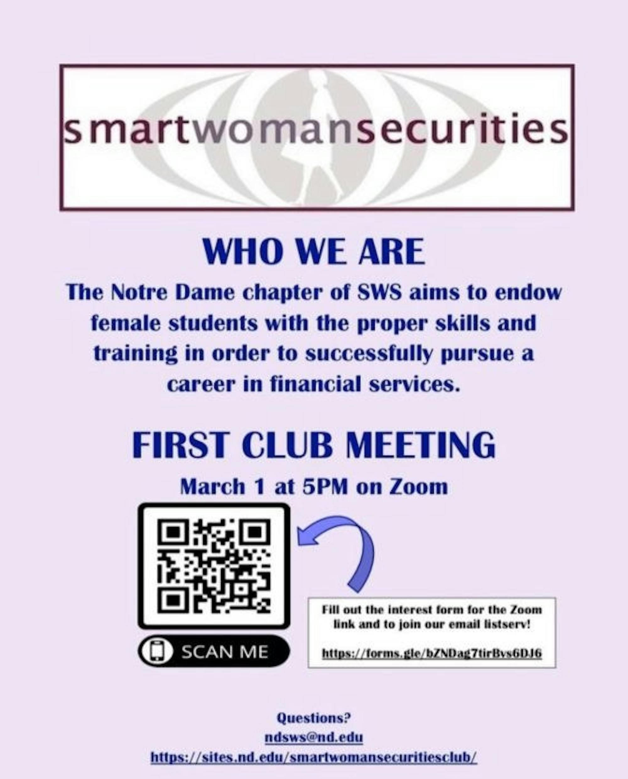 Notre Dame’s chapter of Smart Woman’s Securities (SWS) aims to empower the future generation of female investors at the University to help shatter the financial industry’s glass ceiling. The organization held its first meeting of the semester Monday evening.