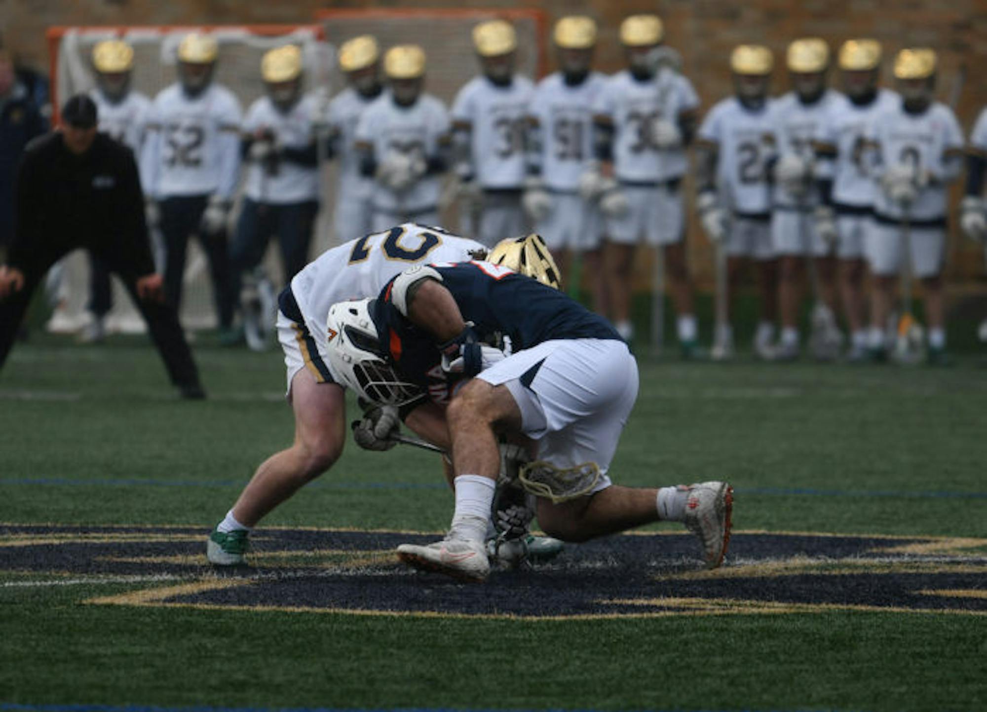 Notre Dame sophomore midfielder faceoff specialist Will Lynch (left) battles for possession in a game against Virginia on March 25 at Arlotta Stadium.