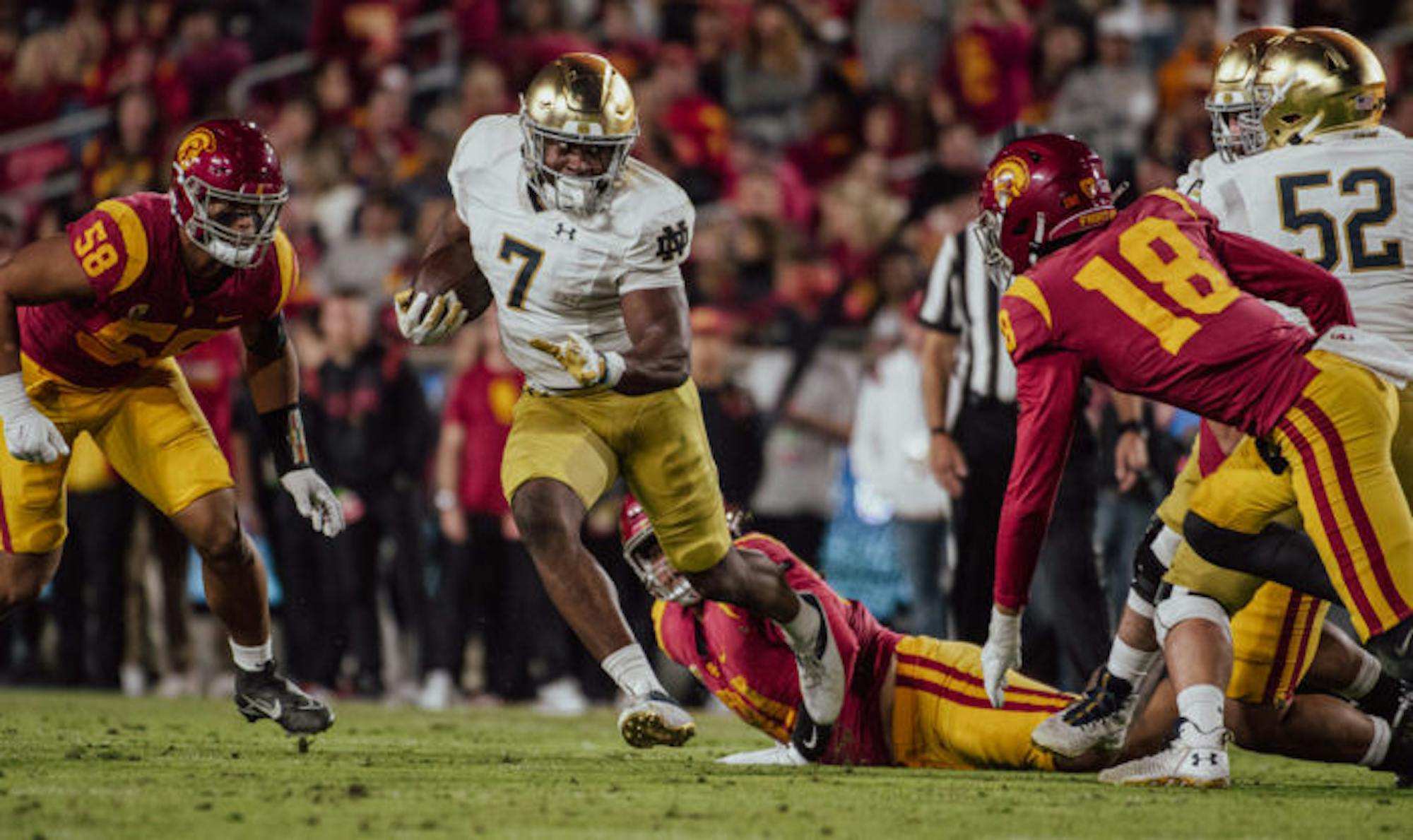 Irish RB Audric Estime breaks free during Notre Dame’s 38-27 loss to USC on Nov. 26.