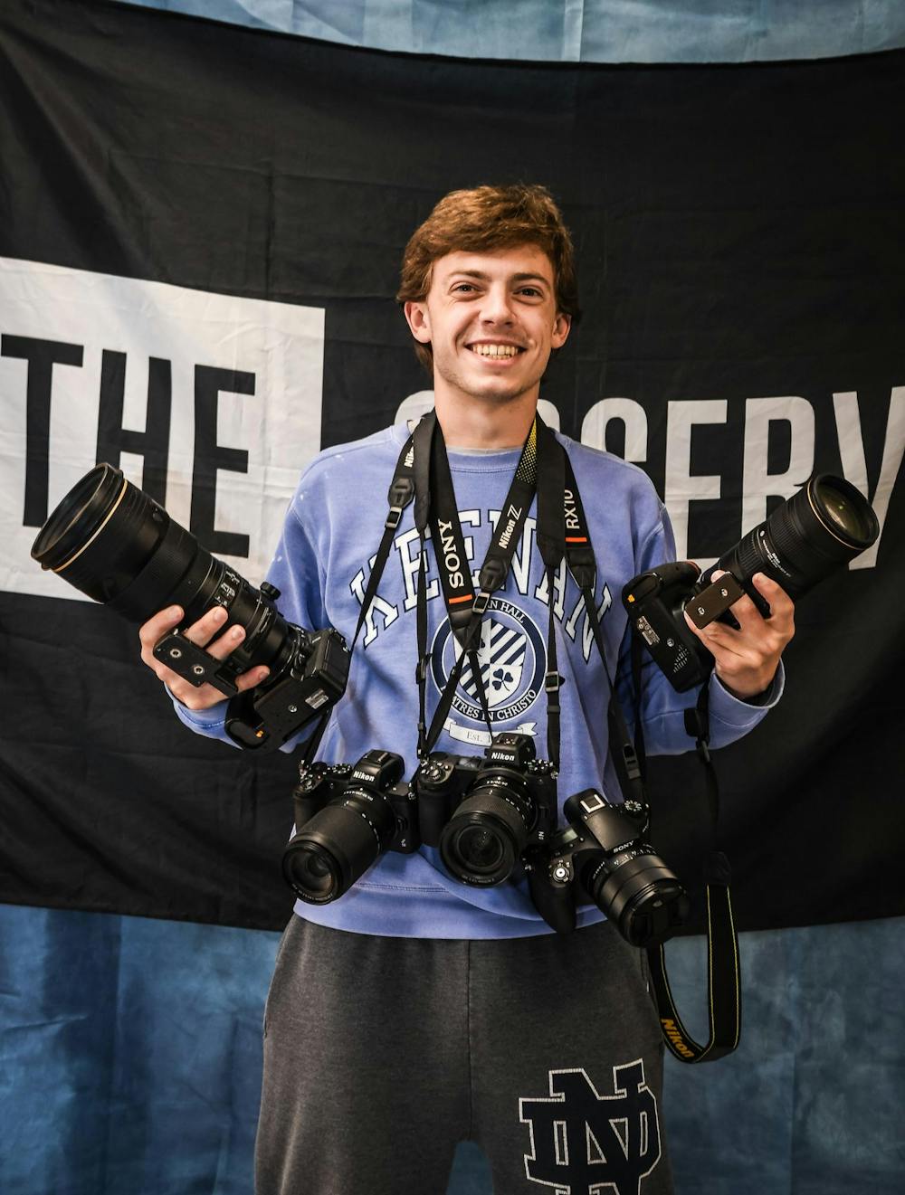 Managing editor Gray Nocjar poses with cameras in The Observer offices at 902 Hesburgh Library.