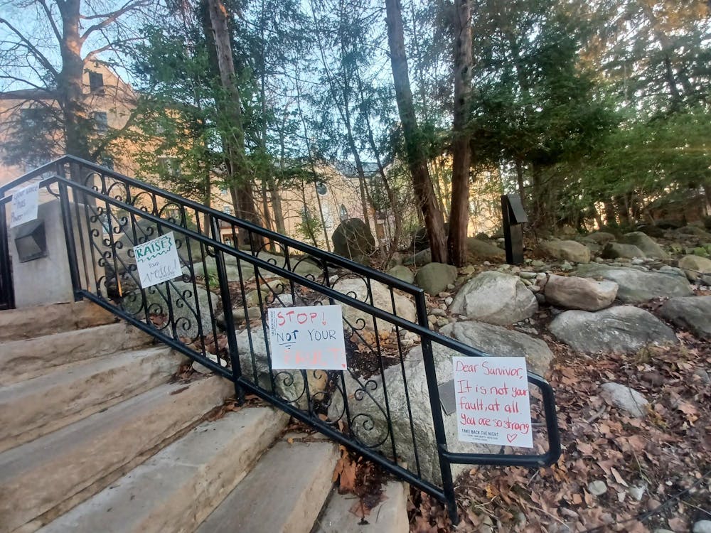During the multifaith prayer service, signs were seen across the stairs at the Grotto of Our Lady of Lourdes in support of sexual violence survivors.
