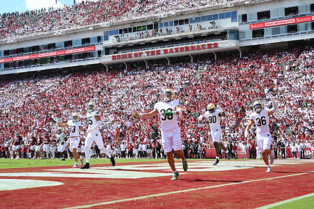 Notre Dame football players celebrate in the end zone during a 56-13 victory over Arkansas at Donald W. Reynolds Razorback Stadium on Sept. 27, 2025.