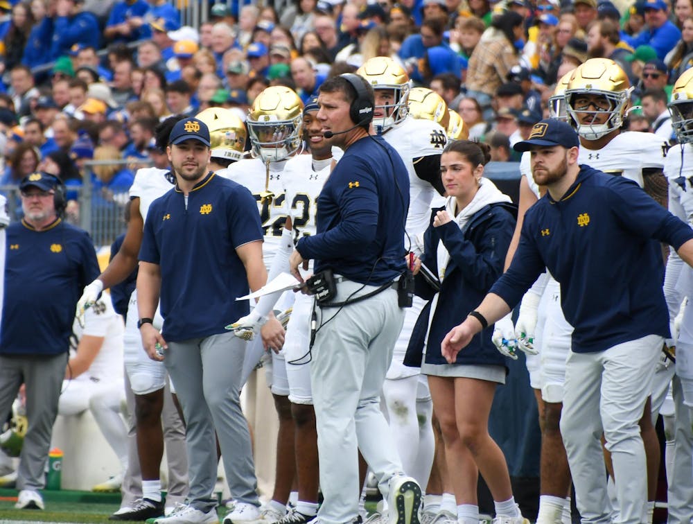 Defensive coordinator Chris Ash stands on the sideline during Notre Dame’s commanding 37-15 victory over Pittsburgh at Acrisure Stadium on Nov. 15, 2025. Ash has turned his unit around after a 0-2 start. Mariella Taddonio