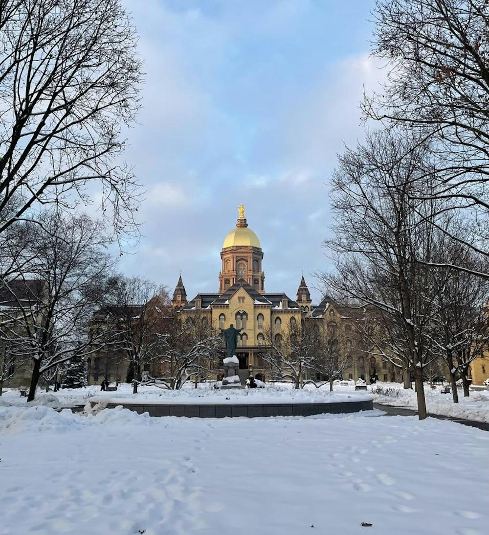 The Golden Dome shines at sunset over a campus covered with snow. The storm this weekend disrupted travel plans for many students. Liam Kelly