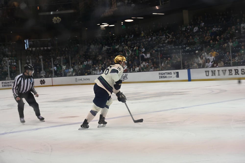Junior defenseman Paul Fischer carries the puck during Notre Dame's 3-0 defeat of St. Lawrence at Compton Family Ice Arena on Oct. 17, 2025. Taylor O’Brien