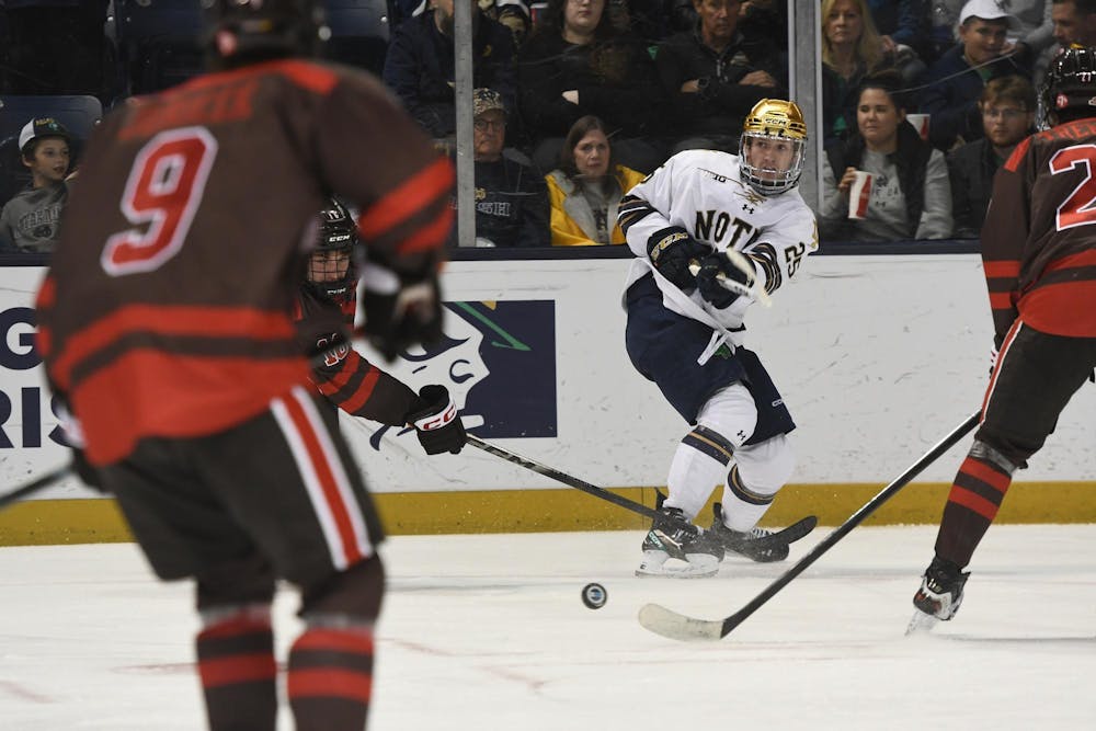 Junior forward Carter Slaggert feeds a pass through traffic during Notre Dame’s defeat of St. Lawrence at Compton Family Ice Arena on Oct. 16, 2025.
