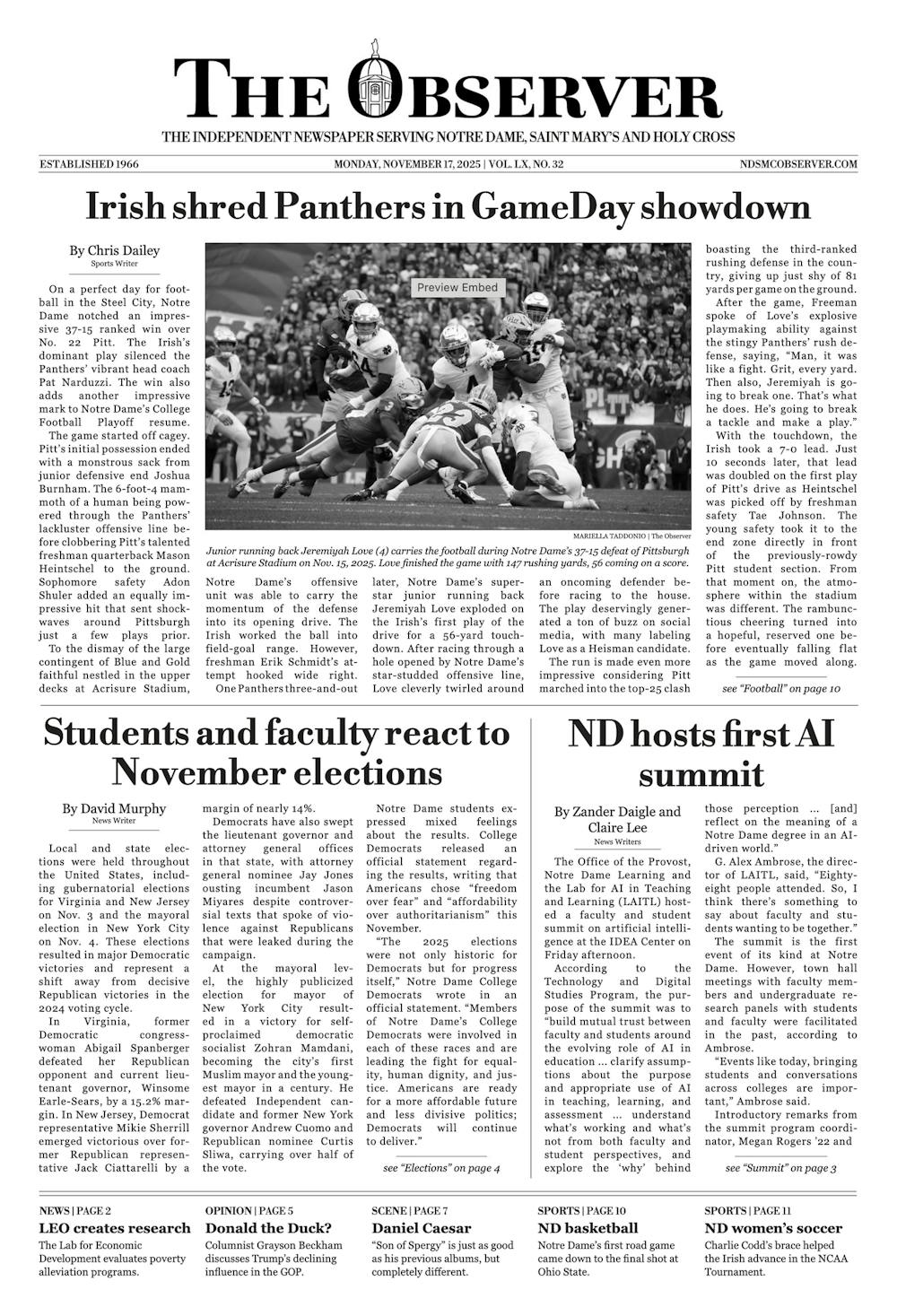 The front page of The Observer for Monday, November 17, 2025 Gray Nocjar