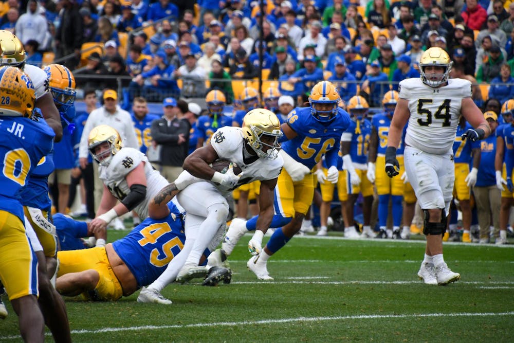 Junior running back Jadarian Price rides the tackle in Notre Dame's 37-15 victory over Pittsburgh at Acrisure Stadium on Nov. 15, 2025. Price pairs with Heisman candidate and fellow junior Jeremiyah Love to form one of the best backfield tandems in the nation.