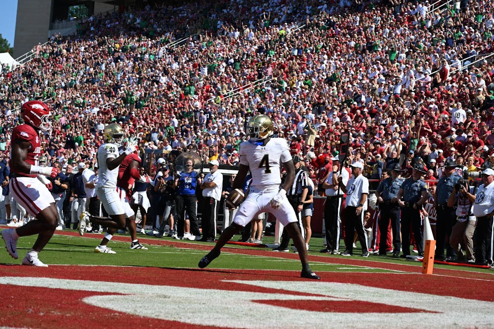 Junior running back Jeremiyah Love streaks into the end zone during a 56-13 victory over Arkansas at Donald W. Reynolds Razorback Stadium on Sept. 27, 2025. Gray Nocjar