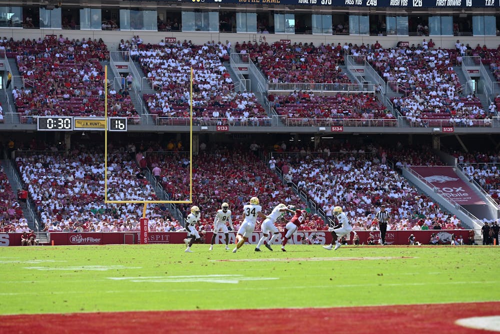 Notre Dame football players surround the opponent during a 56-13 victory over Arkansas at Donald W. Reynolds Razorback Stadium on Sept. 27, 2025. Gray Nocjar