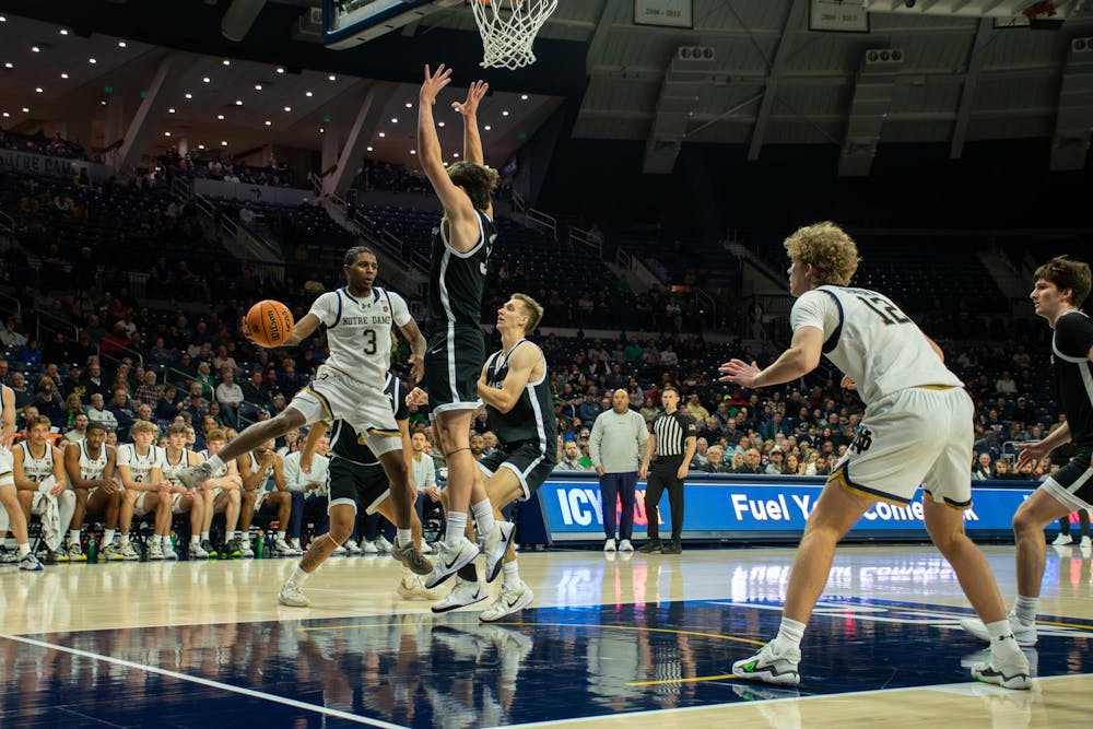 Junior guard Markus Burton jumps to make a pass in Notre Dame's 86-79 win over Bellarmine inside Purcell Pavilion on Nov. 19, 2025. Burton is averaging 19.4 points per game through five contests in 2025.