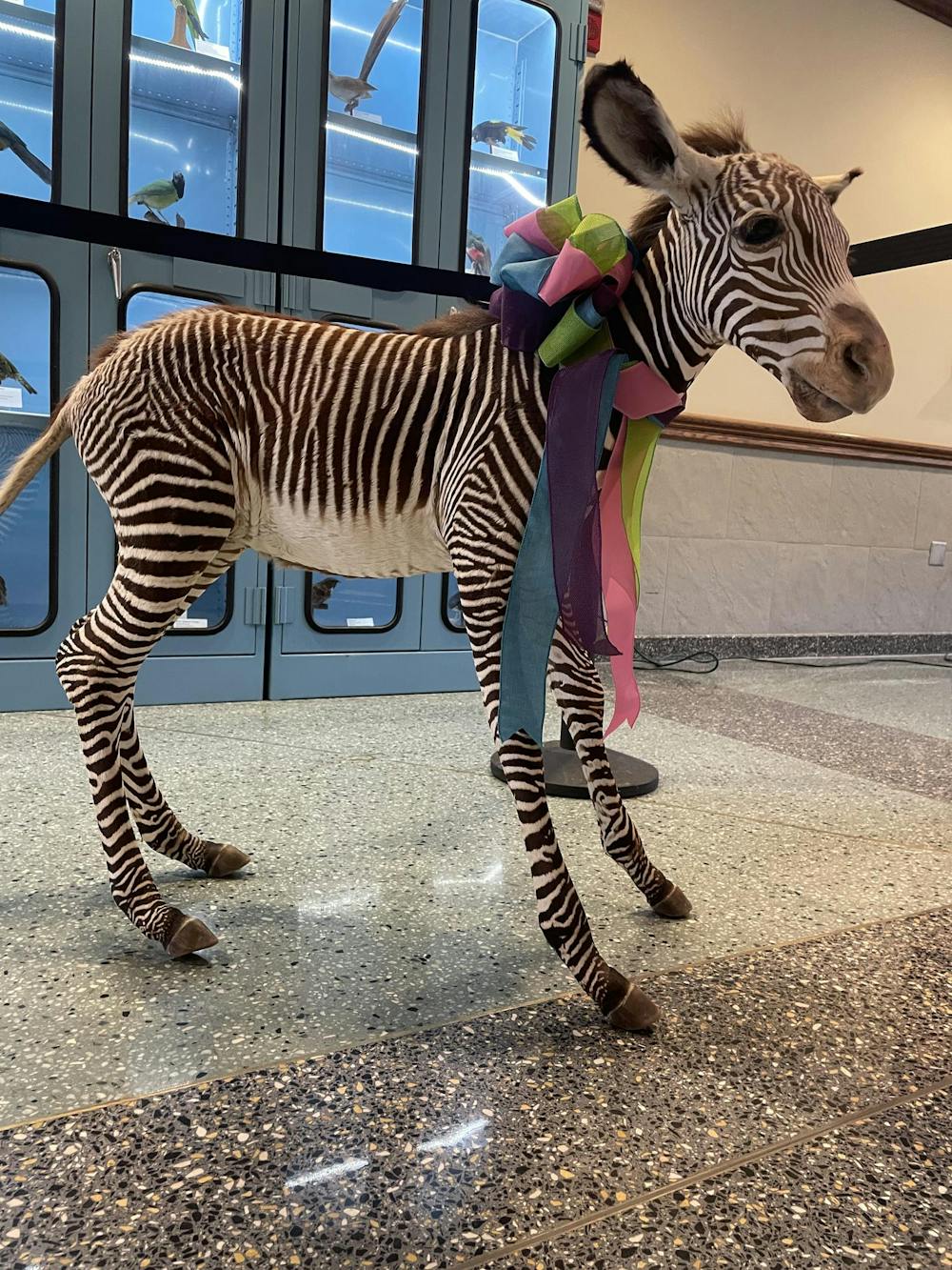 A baby zebra on display next to an exhibit of birds in the galleria of the Jordan Hall of Science on Feb. 25, 2026.