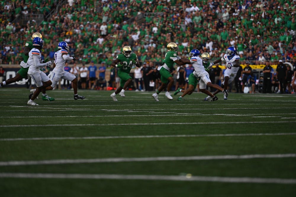 Junior running back Jadarian Price takes off in Notre Dame’s 28-7 win against Boise State in Notre Dame Stadium on Oct. 4, 2025. Price’s score last weekend put him up to seven touchdowns this season.