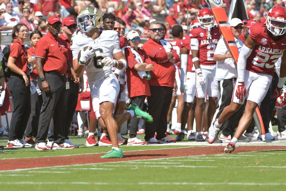 Junior wide receiver Jordan Faison runs with a ball thrown by sophomore quarterback CJ Carr during a 56-13 victory over Arkansas at Donald W. Reynolds Razorback Stadium on Sept. 27, 2025.