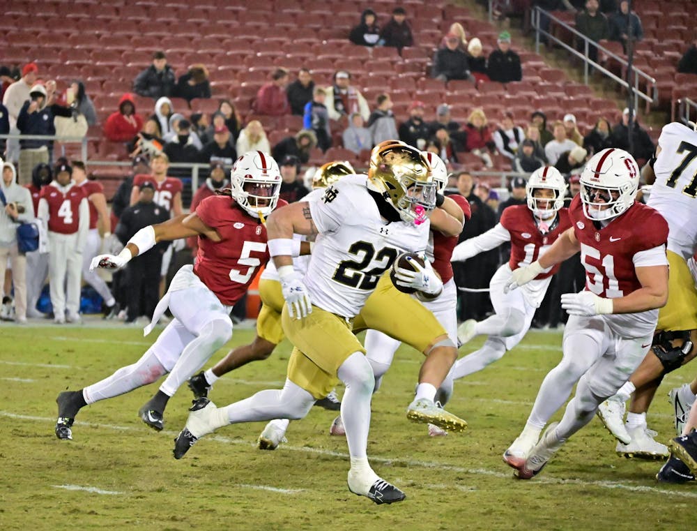 Sophomore running back Aneyas Williams gains yards in Notre Dame’s 49-20 defeat of Stanford at Stanford Stadium in Palo Alto, California, on Nov. 29, 2025. Keira Jones