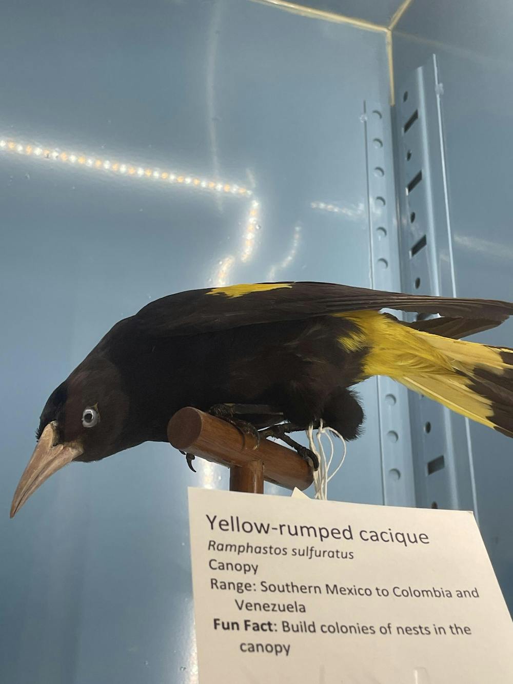 A yellow-rumped cacique is perched in a cabinet as part of the Museum of Biodiversity's bird display, which organizes the specimens by geographical location and area of the forest the birds inhabit. Gray Nocjar