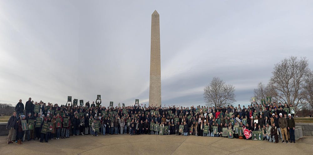 March for Life 3.JPG Notre Dame students pose in front of the Washington Monument at the March for Life. Courtesy of Jake Struby.
