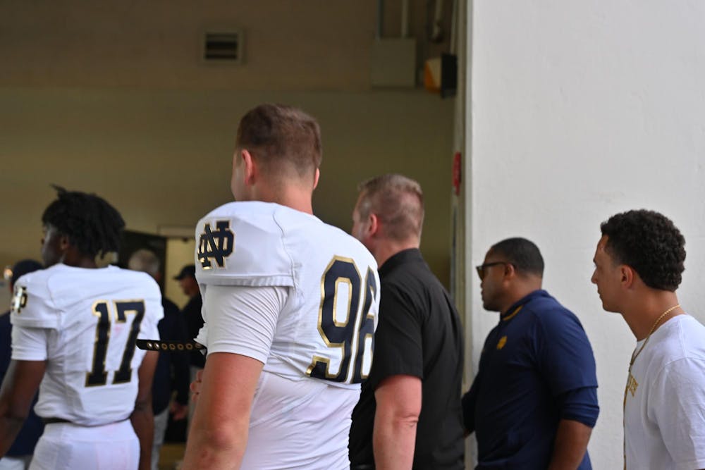 Notre Dame football players deposit their helmets after a 56-13 victory over Arkansas at Donald W. Reynolds Razorback Stadium on Sept. 27, 2025. Gray Nocjar