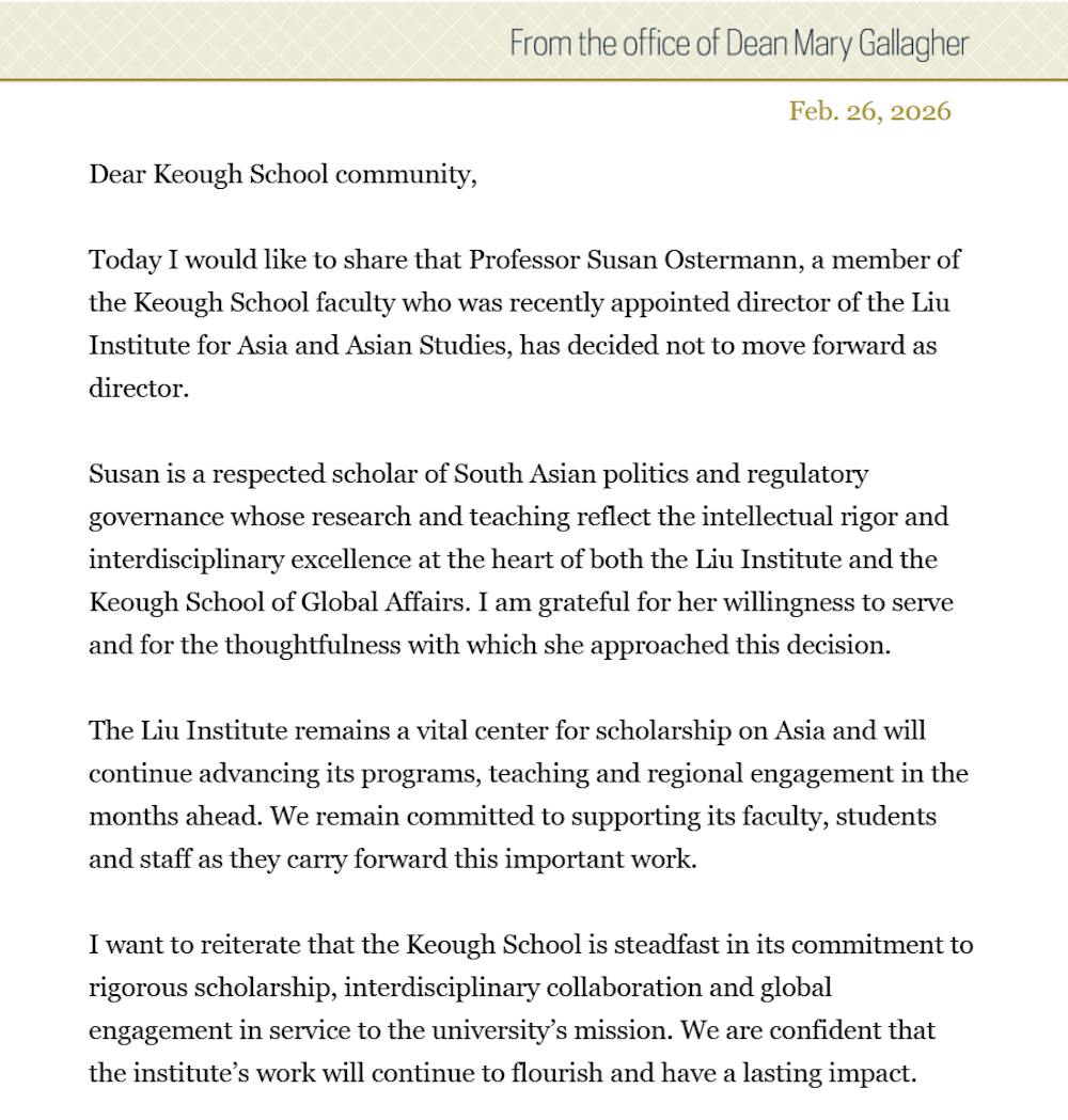 An email sent by Keough School of Global Affairs dean Mary Gallagher announcing Susan Ostermann's decision not to move forward with directing the Liu Institute, sent Feb. 26, 2026.