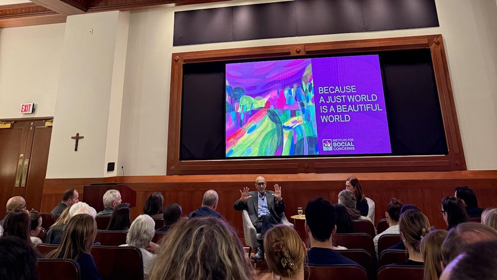 Dr. Tom Catena discusses his experience as a warzone physician in mountainous Sudan Wednesday in the Eck Center Auditorium. Sophia Magnano