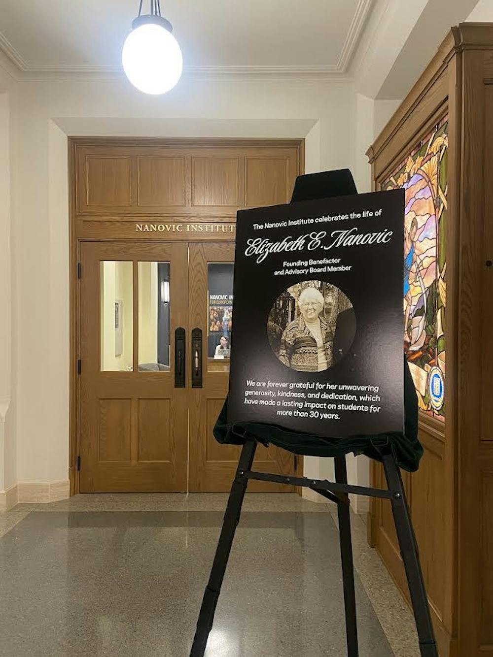 A photo of Elizabeth Nanovic honors her life outside of the Nanovic Institute, in Jenkins and Nanovic Hall. Annelise Demers