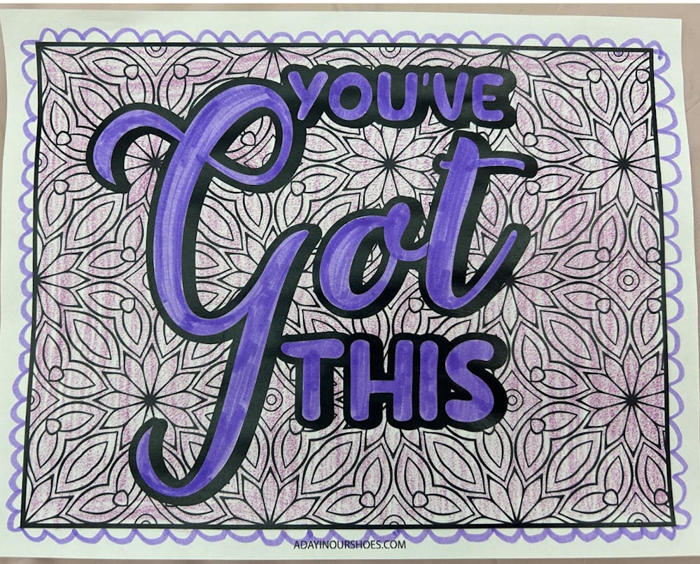 This is an example of the various coloring sheets provided to show the words of encouragement one should have for themselves, always. Zyniaya Baez