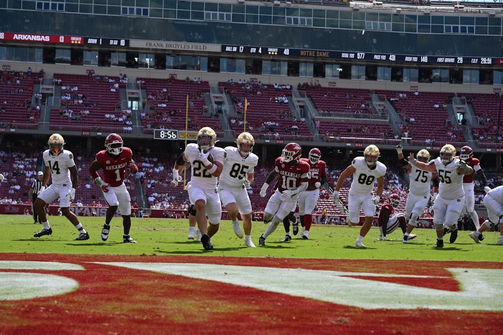 Sophomore running back Aneyas Williams streaks towards the end zone during a 56-13 victory over Arkansas at Donald W. Reynolds Razorback Stadium on Sept. 27, 2025.