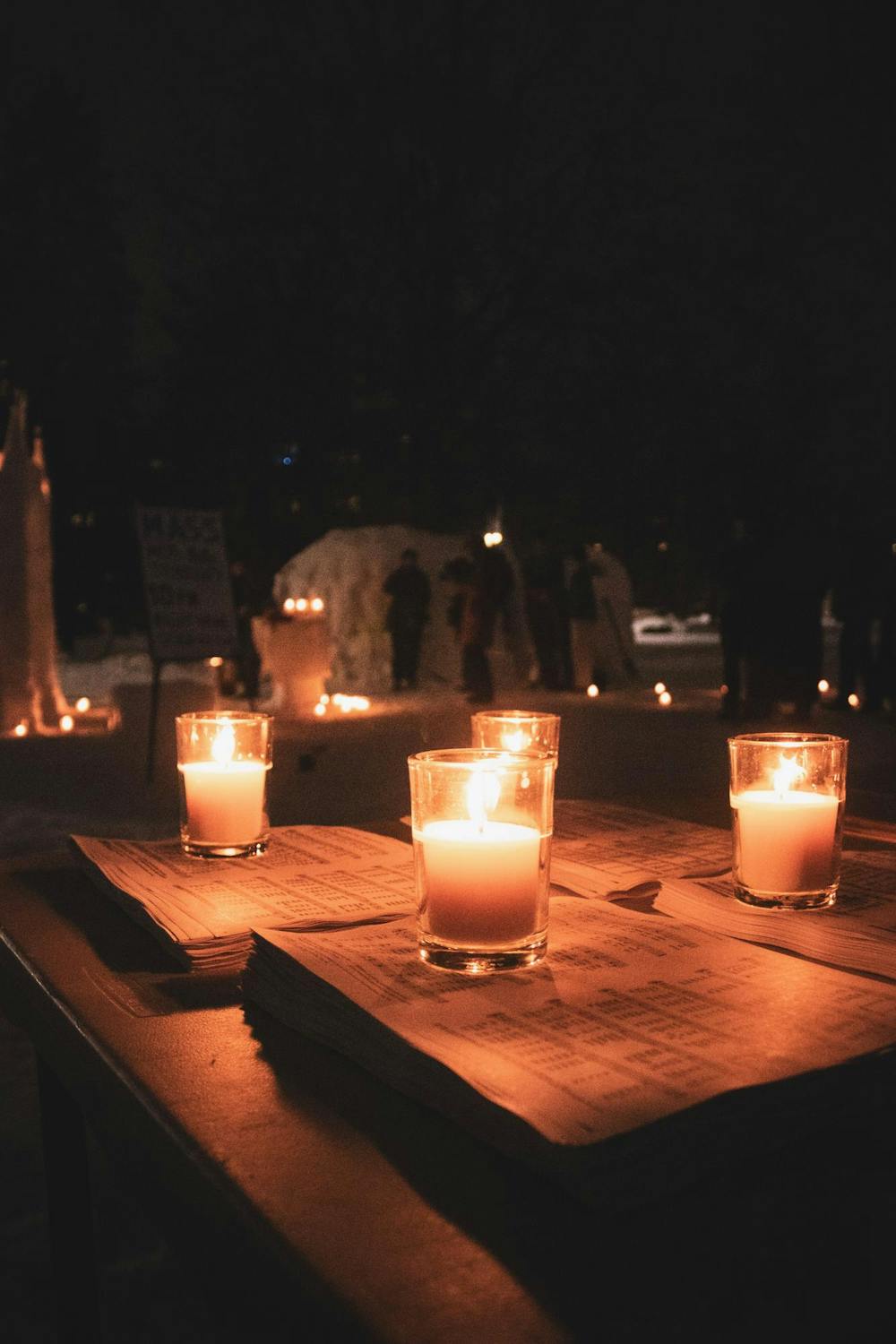 Four candles, originally intended for the Grotto of our Lady of Lourdes, used during the Candlemas Mass in the St. Olaf’s Ice Chapel at Notre Dame on Feb. 2, 2026.