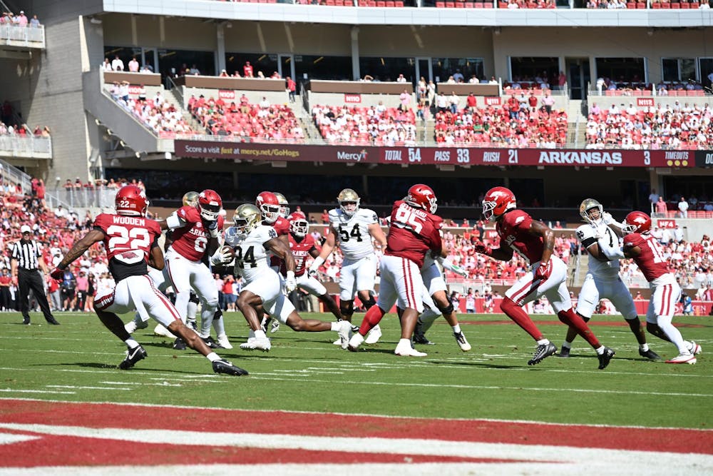 Junior running back Jeremiyah Love runs toward the end zone during a 56-13 victory over Arkansas at Donald W. Reynolds Razorback Stadium on Sept. 27, 2025.