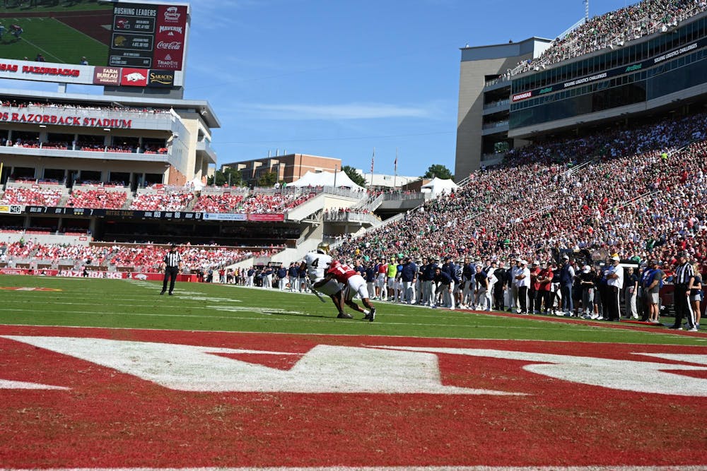 Junior running back Jeremiyah Love receives a ball during a 56-13 victory over Arkansas at Donald W. Reynolds Razorback Stadium on Sept. 27, 2025.