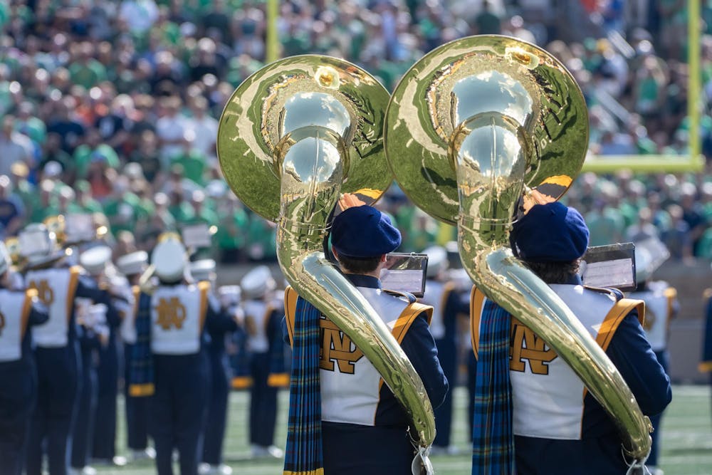 Two tuba players in The Band of the Fighting Irish perform during halftime of a football game against Boise State in Notre Dame Stadium on Oct. 4, 2025. Declan Lee