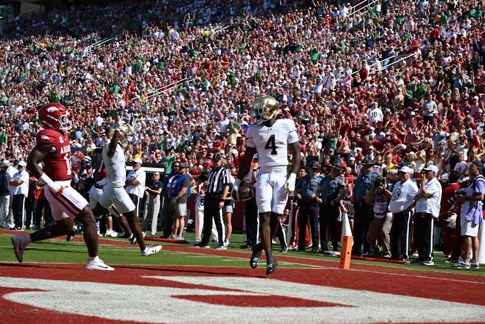 Junior running back Jeremiyah Love runs into the end zone during a 56-13 victory over Arkansas at Donald W. Reynolds Razorback Stadium on Sept. 27, 2025.