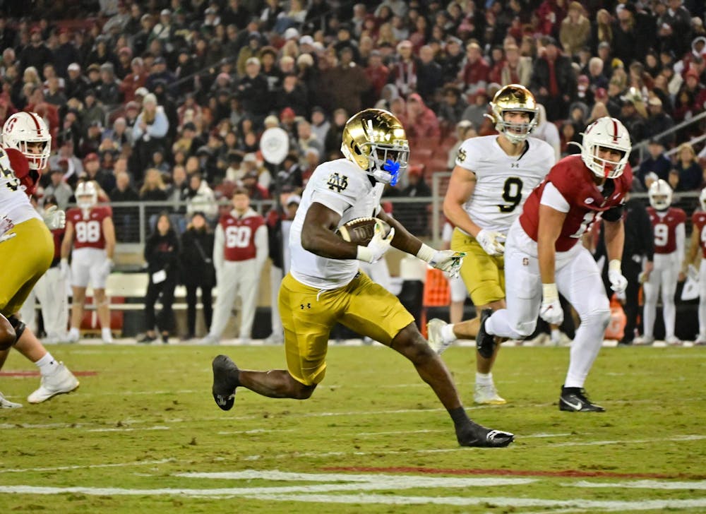 Junior running back Jeremiyah Love makes a run for it in the Irish’s 49-20 defeat of Stanford in Stanford Stadium in Palo Alto, California, on Nov. 29, 2025.