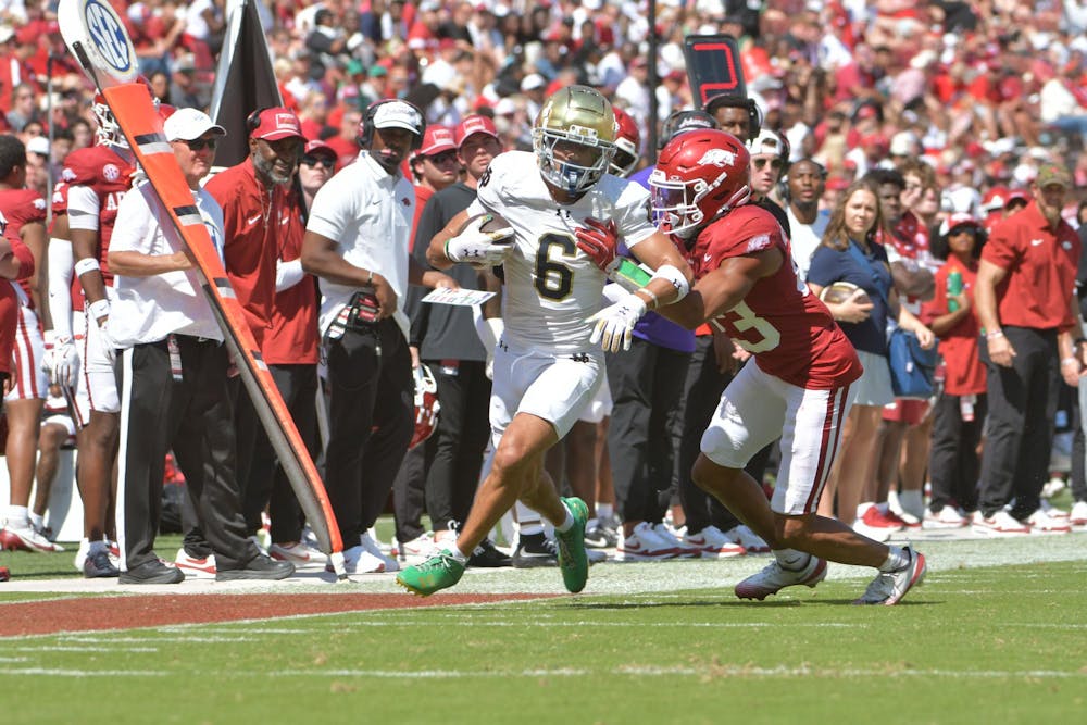 Junior wide receiver Jordan Faison runs with the football during a 56-13 victory over Arkansas at Donald W. Reynolds Razorback Stadium on Sept. 27, 2025.