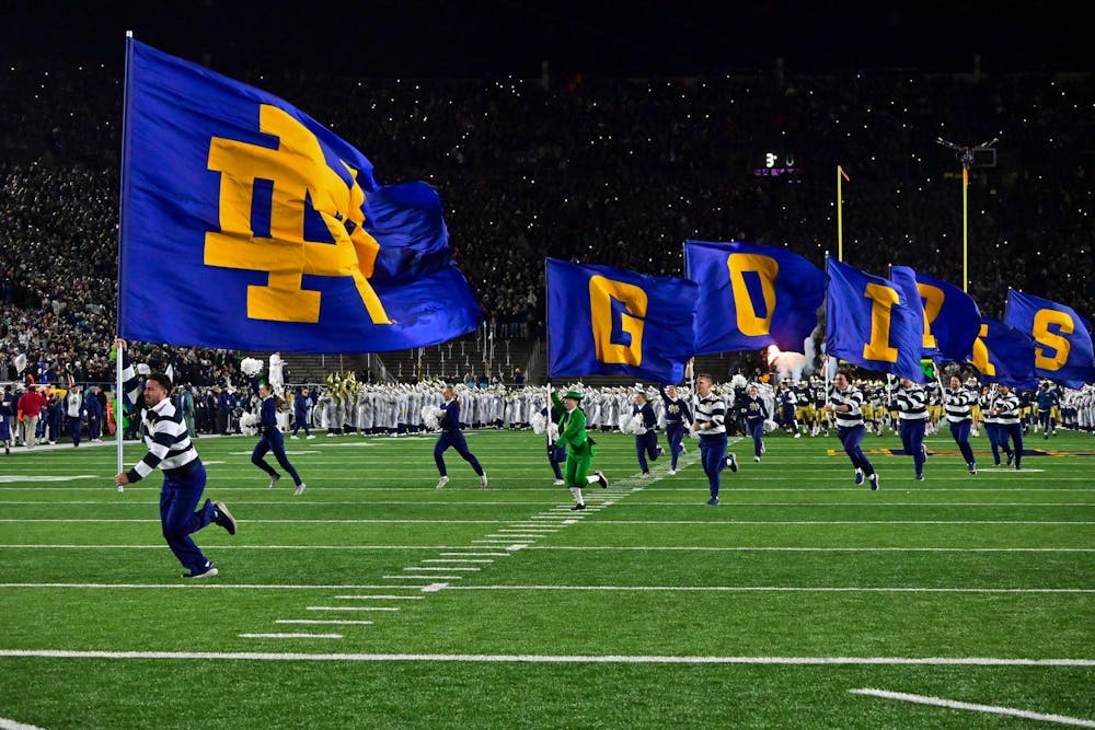 The Irish run onto the field in a packed Notre Dame Stadium before their 49-10 victory against Navy on Nov. 8, 2025. Notre Dame improved to 7-2 with the win.