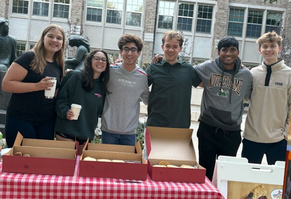 Members of the Department of South Bend Engagement host a South Bend Coffee Shop event outside O'Shaughnessy Hall to celebrate National Coffee Day. Courtesy of Jacob Arulandu. Chloe Hanford