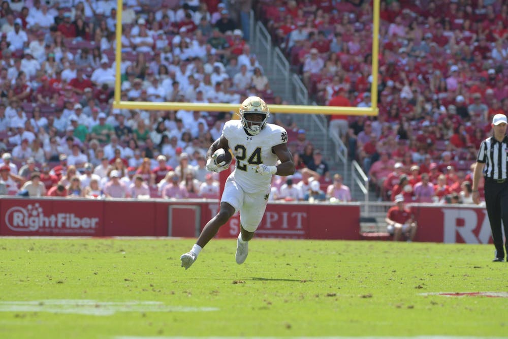 Junior running back Jadarian Price dashes untouched to the end zone during Notre Dame's 56-13 victory over Arkansas in Razorback Stadium on Sept. 27, 2025.