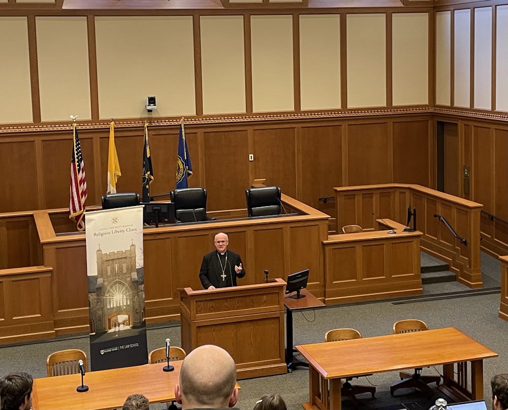 Bishop Rhoades speaks in the McCartan Courtroom in the Law School Monday afternoon on Nov. 17, 2025. Liam Kelly