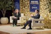 Pete Buttigieg sits on stage with Mary Gallagher during the fireside chat. The event, titled “Leadership, Innovation and the Next Generation,“ was sponsored by the Keough School of Global Affairs. Courtesy of Ryan Juszkiewicz/University of Notre Dame.