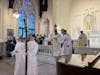 Fr. Bill Lies, provincial superior for the U.S. Province of Priests and Brothers for the Congregation of Holy Cross (far right), flanked by Fr. Felipe Campos (center left) and Fr. Joseph Lorenz (center right) and led by campus minister Kacie Barrett (bottom left) and junior Hannah Teich (bottom center) process out of Holy Spirit Chapel at the end of the hundredth anniversary dedication Mass on April 24, exactly 100 years from the original dedication Mass on April 24, 1926.