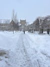 Prominent campus sidewalks connecting DeBartolo Hall with Main Circle are covered in snow and ice on Monday.