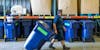 A building services team member wheels a recycling bin, representative of the waste diversio program. Image courtesy of John Kalemkerian.
